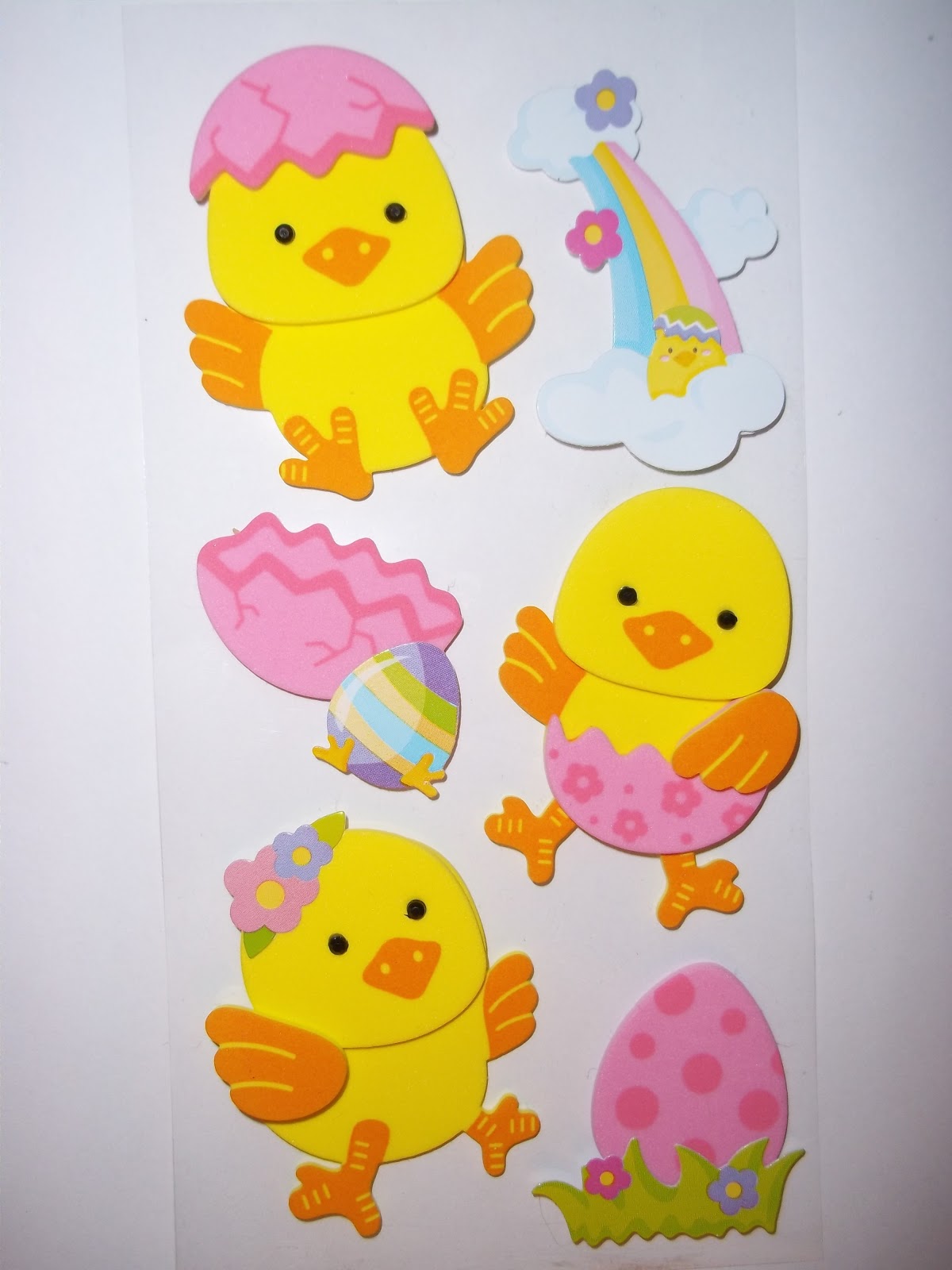 I have been looking for a basket or container of sorts to store some of my pens in (they need to be stored horizontally). I was not about to drive to the packaging warehouse about 45kms away (a smorgasbord of all things plasticky and storagey) - seemed a waste of time and petrol for just one thing! Went down to the local mall - little shop called the Crazy Store - they have everything from balloons to baskets, pegs to paper, etc. Did not find what I was looking for but I did spot some "Easter" looking foam and foil stickers for a couple of Rands - which I was absolutely compelled to buy!