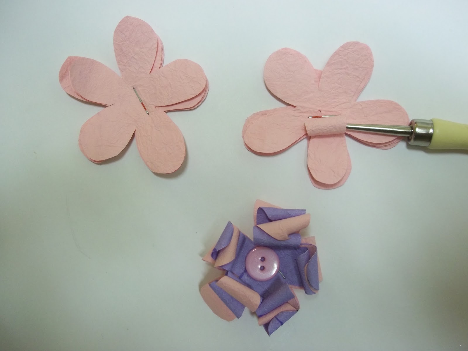 Cut five of the same shape flower (longish petals work best for this bloom). Layer the five shapes on top of one another with the petals lined up. Put a staple through the middle of the five layers to secure the bloom. Now take a knitting needle (or something similar - I have used one of my pewter tools) - start at the tip of the petal and roll it around the needle towards the middle of the flower. Repeat this with each petal on each layer. Glue a button over the staple.