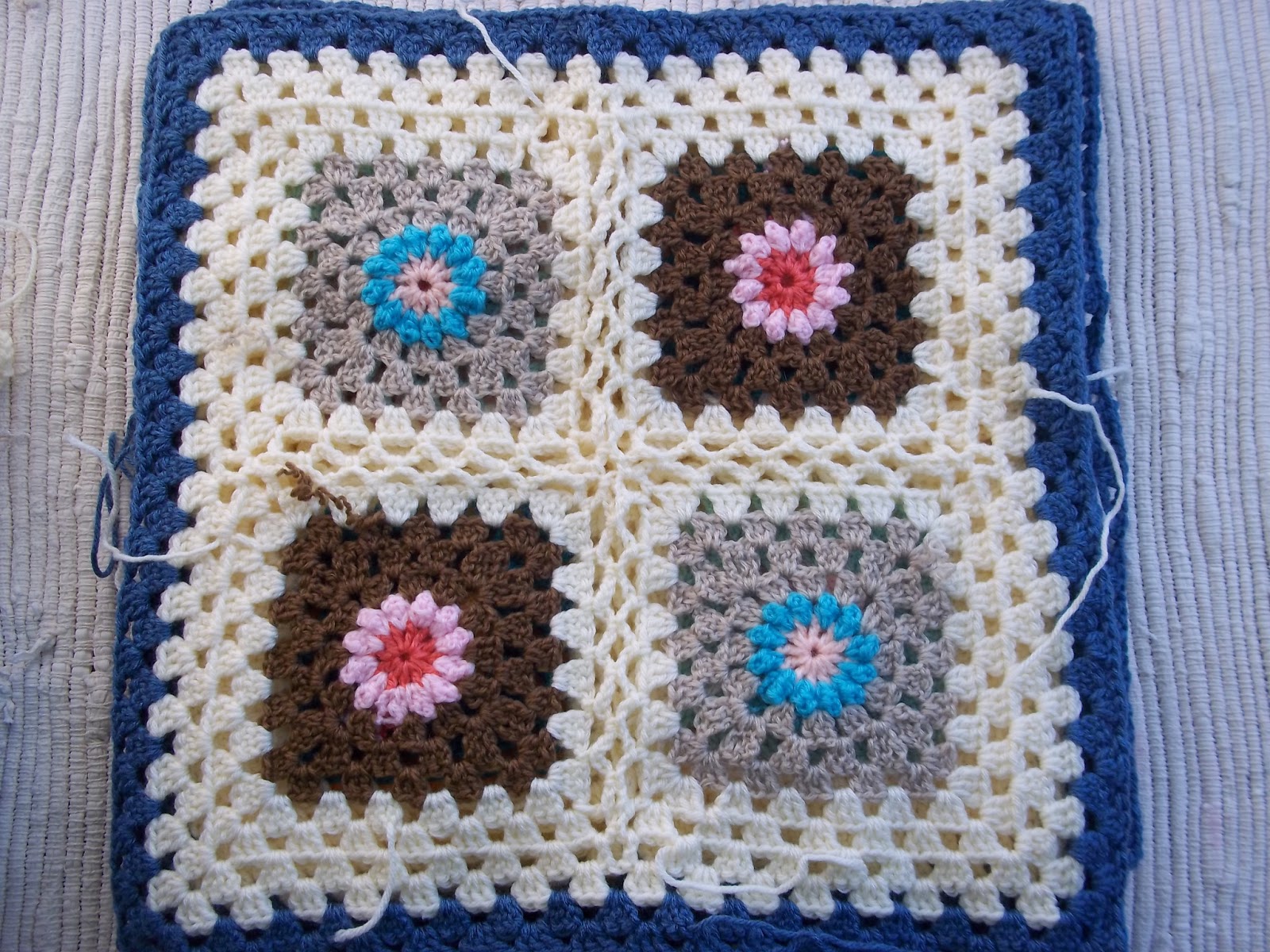 I made sixteen of these, chain joining them on the last round of each completed square:. I then crocheted two rows of granny clusters and 1 chain "joining" row around each block in denim blue