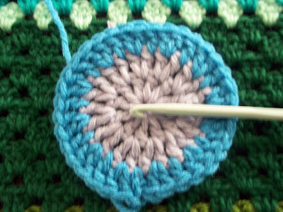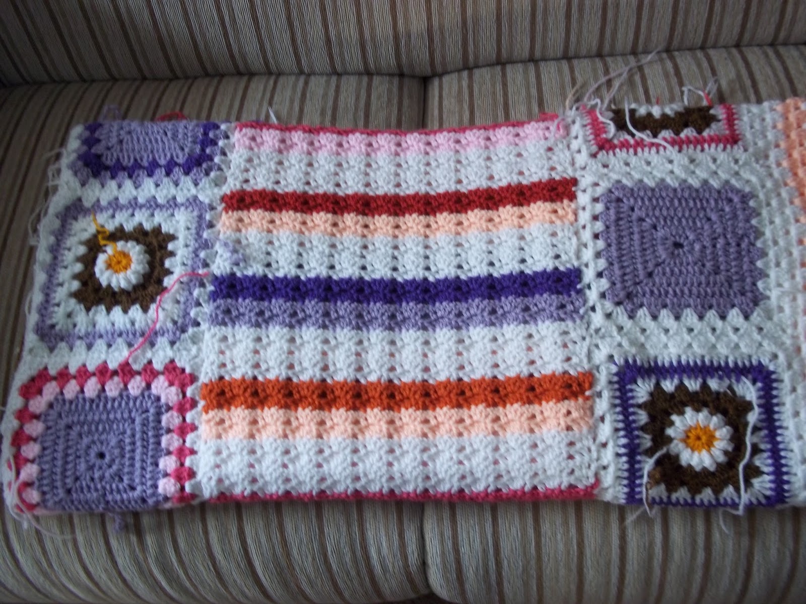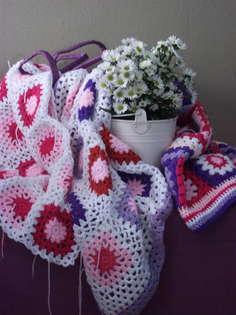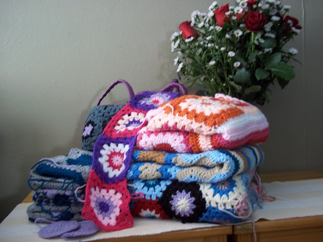 Way back in May a couple of projects were frogged and re-invented. I was quite happy with the result of my re-inventions. My daughter has however frogged several re-inventions, add to this the leftover yarn from the groovyghan she made for her friend - and you have quite a motley collection of yarns and colours. She asked me to design a groovyghan for her using ALL this yarn as well as squares saved from previous froggings - here is a photo of what it looks like so far::